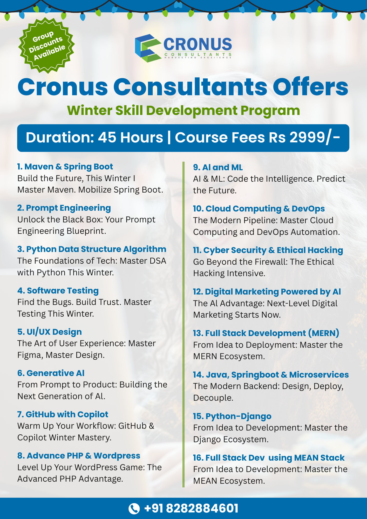 From Digital Marketing powered by AI, Cloud Computing & DevOps, Cyber Security & Ethical Hacking, Full Stack Development (MERN), Java, Spring Boot & Microservices, Advanced PHP & WordPress these courses focus on practical applications that employers demand in 2025.